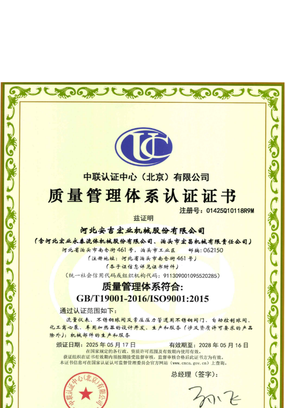 河北宏業永泰流體機械股份有限公司(原泊頭儀表總廠),生產流量儀表產品有三十多年的歷史。參加了節流裝置國家標準GB/T2624-1981的起草工作。公司占地12萬平方米,注冊資金3500萬元。主要產品有節流裝置、儀器儀表、各類不銹鋼閥門、各種化工離心泵。公司取得了ISO9001:2015質量體系認證、挪威船級社CE認證、出口產品Emark認證、特種設備制造許可證等。同時河北宏業永泰還是中石化物資供應商網絡成員,取得了中石油、中海油物資供應商準入證,是中國神華集團、華電集團、大唐集團、中廣核等公司合格供應商。產品出口日本、阿爾及利亞等國家。